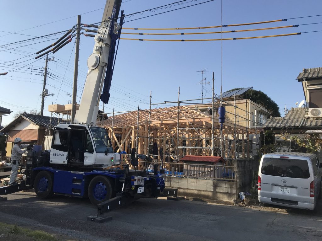 その為敷地内に空きスペースは無い為、道路使用許可をとって道路からの作業になりました。