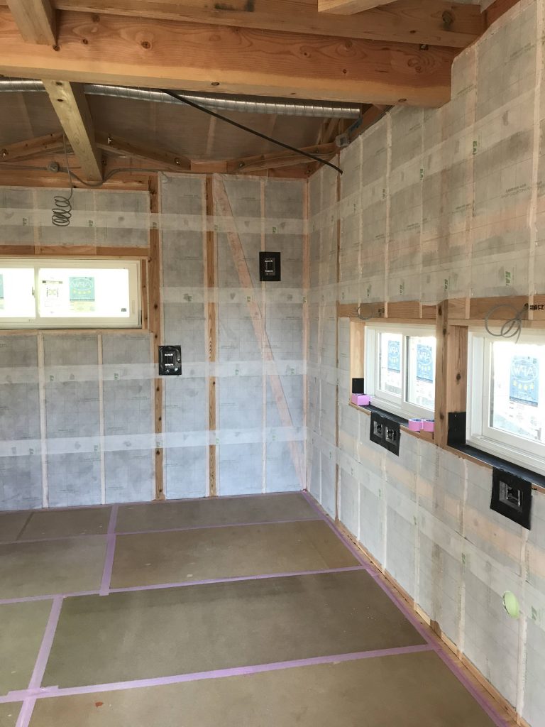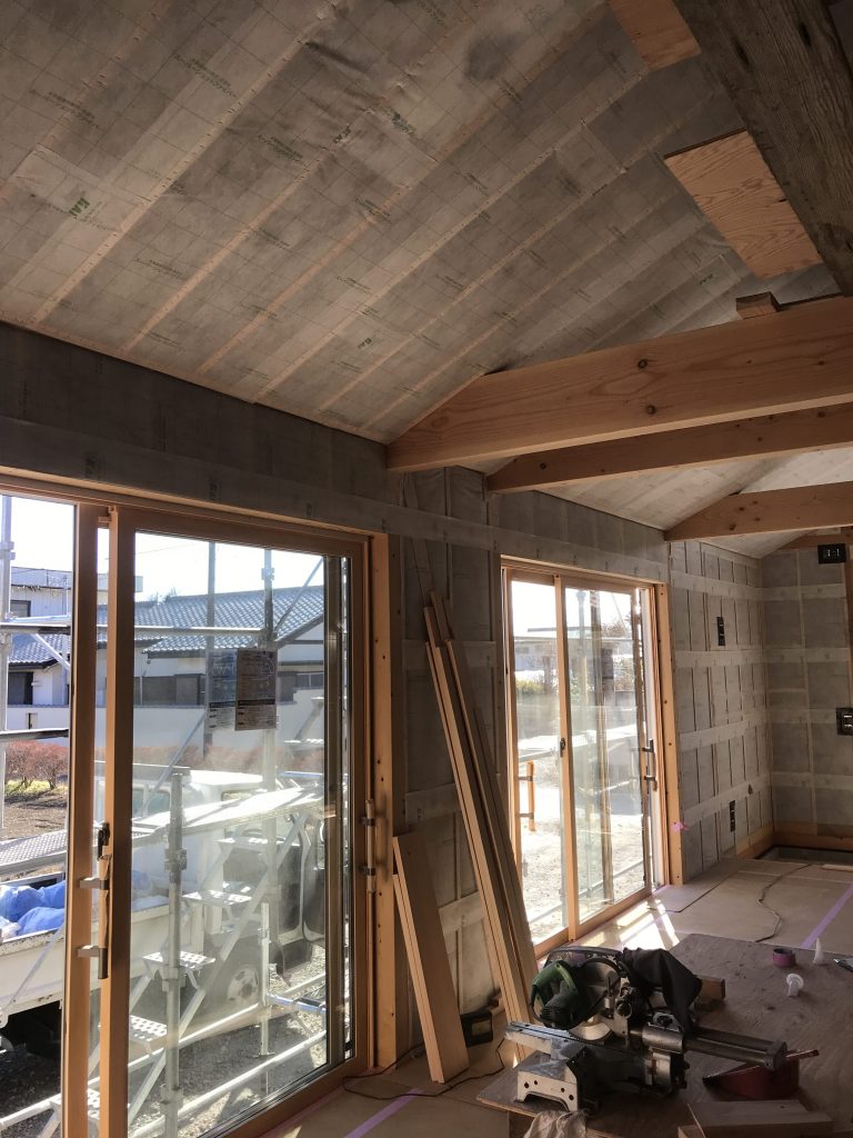 今回は、壁と勾配天井部分。平らな天井の上は天井が出来てからの工事です。